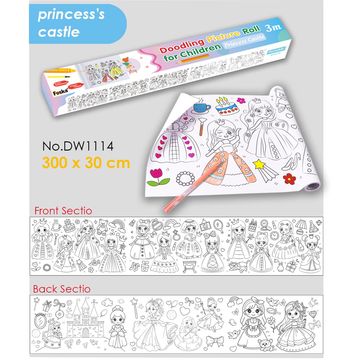 Foska Paiting paper roll- Designed with the utmost care, this DIY paper scroll showcases delightful cartoon characters that will transport your child into a whimsical wonderland. From friendly animals to enchanting landscapes, each stroke of their artistic genius will be accentuated on this distinguished surface.