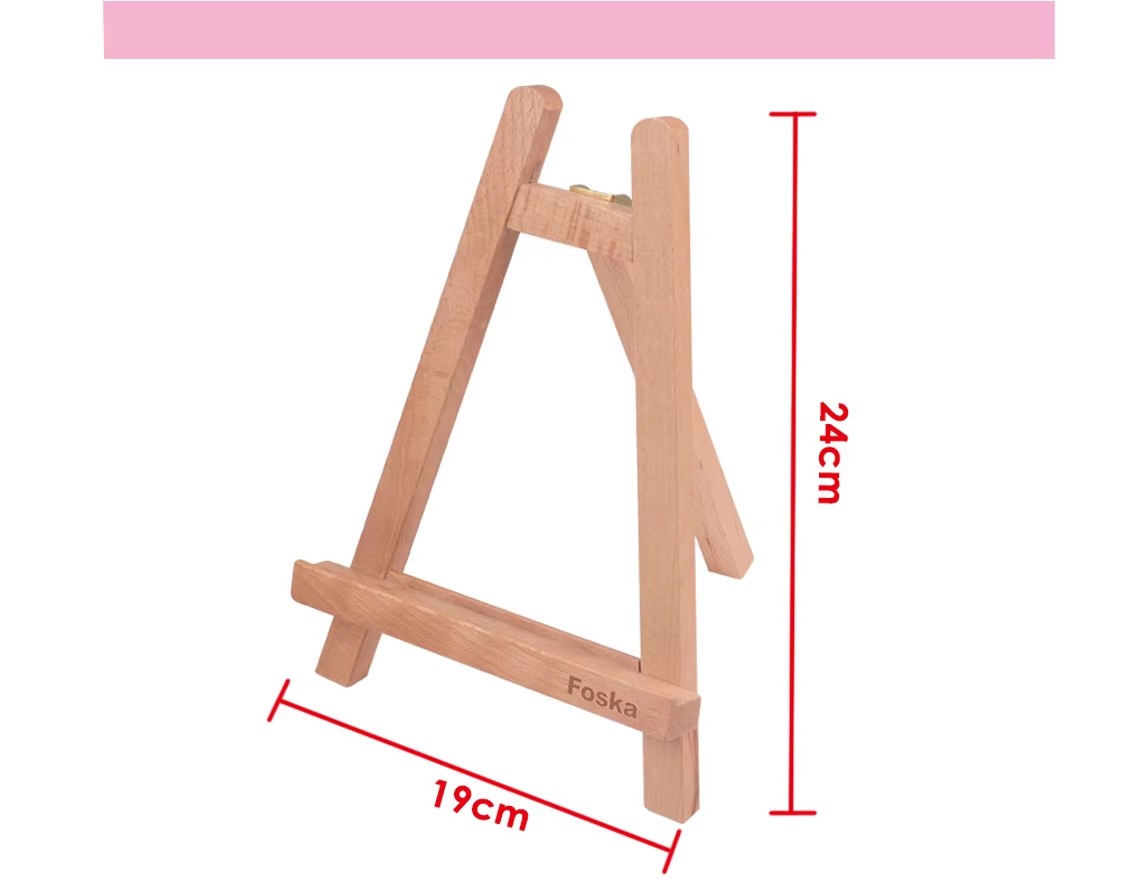 An easel is a freestanding or portable framework used to support canvas, boards, or other surfaces for artistic creation or presentation. It is made of wood, it often features adjustable arms or clips to securely hold the working surface at various angles. Easels come in different types, such as single-pole, tripod, or studio models, each designed for specific uses ranging from painting and drawing to displaying posters or advertisements. They provide artists and presenters with a stable, hands-free platform to showcase their work or create artwork conveniently.