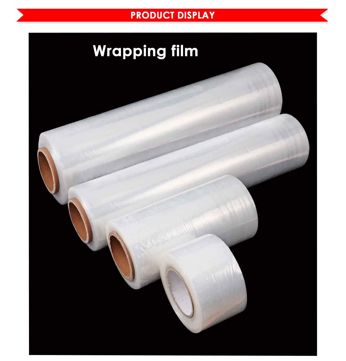 Foska good quality PE wrapping film, there are assorted sizes for choosing. Polyethylene clear.