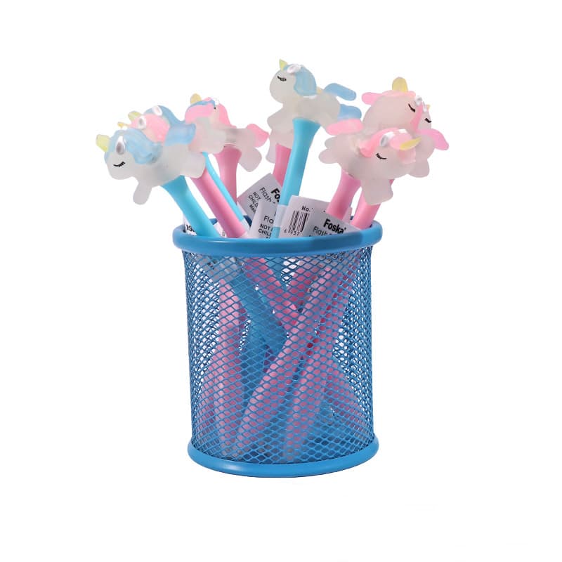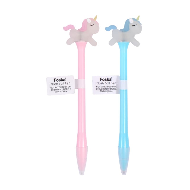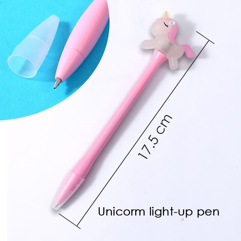 The cute ballpoint pen has a clever top design—soft silicone shaped like a rainbow horse. It feels comfy, adds childlike creativity, and a fun charm. Gently tap it, and red-blue lights flash, making writing dreamy.