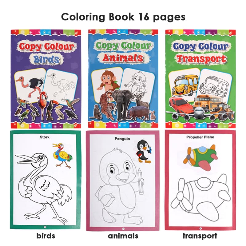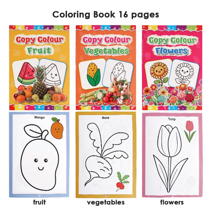 8pages, 6designs birds, animals, transport,fruit, vegetables,flowersbrand :
