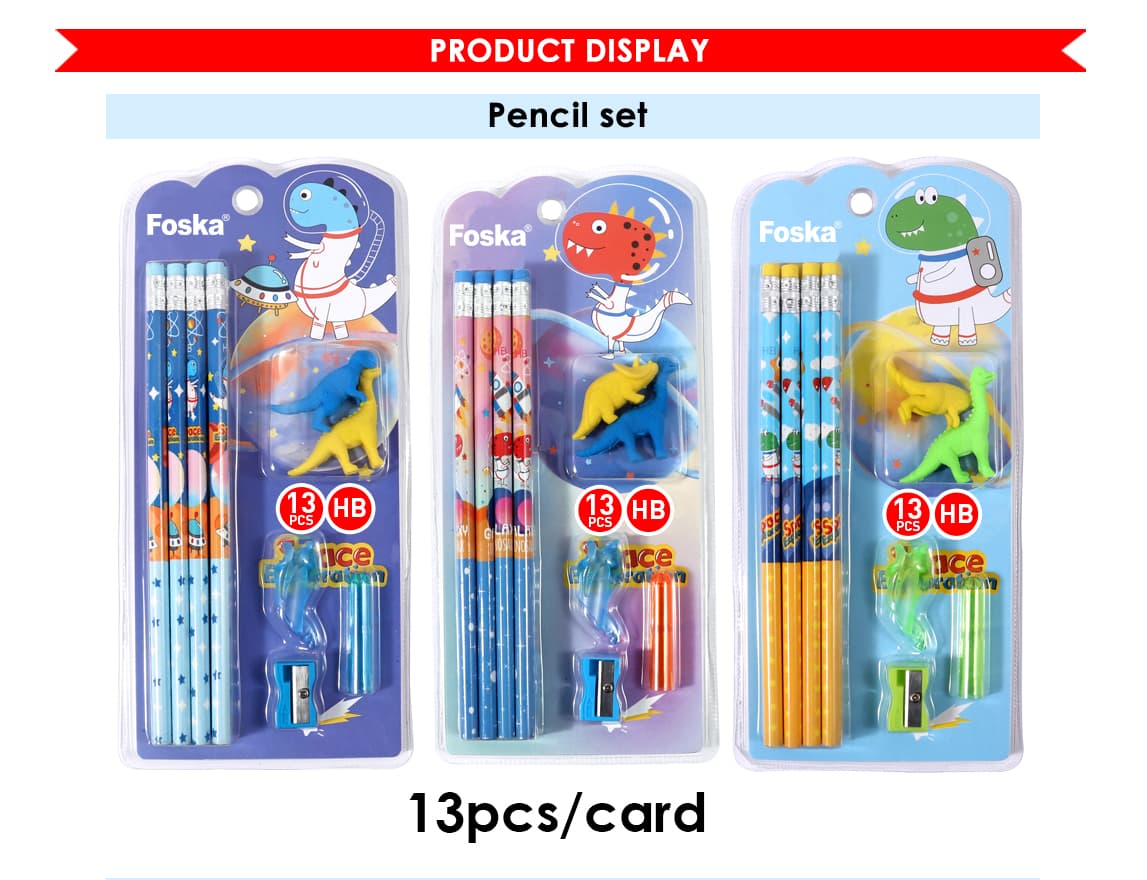 | QB5020 | Dinosaur pencil set, 8 pencils, 2 shape erasers, 1 pen holder, 1 pencil sharpener, 1 pen cap | 1set/card | 144 cards | 144 |