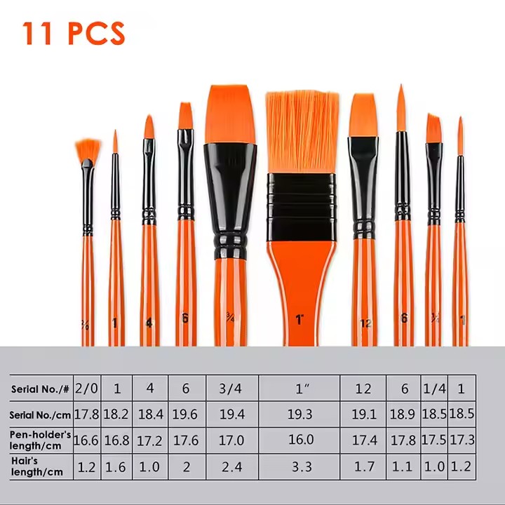 Foska nylon artist brush set, there are 11 pcs in one PVC box. Ideal for water color painting, oil painting.